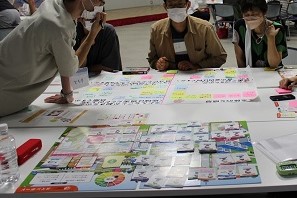 第二部ではゲームで感じたことを振り返ります。「ゲーム終了時、現実だとしたら地域はどんな状態?」「よりよい地域にするには?」などについて、ゲームのボードやカードを横目に見ながらワーク。実は第一部で、まちが崩壊せずにクリアできたのは、5グループのうち1グループのみ。様々な要因で、まちは深刻なことになりました。それを踏まえてのワーク。皆さん思うところを出して付箋で貼っていきました。 |