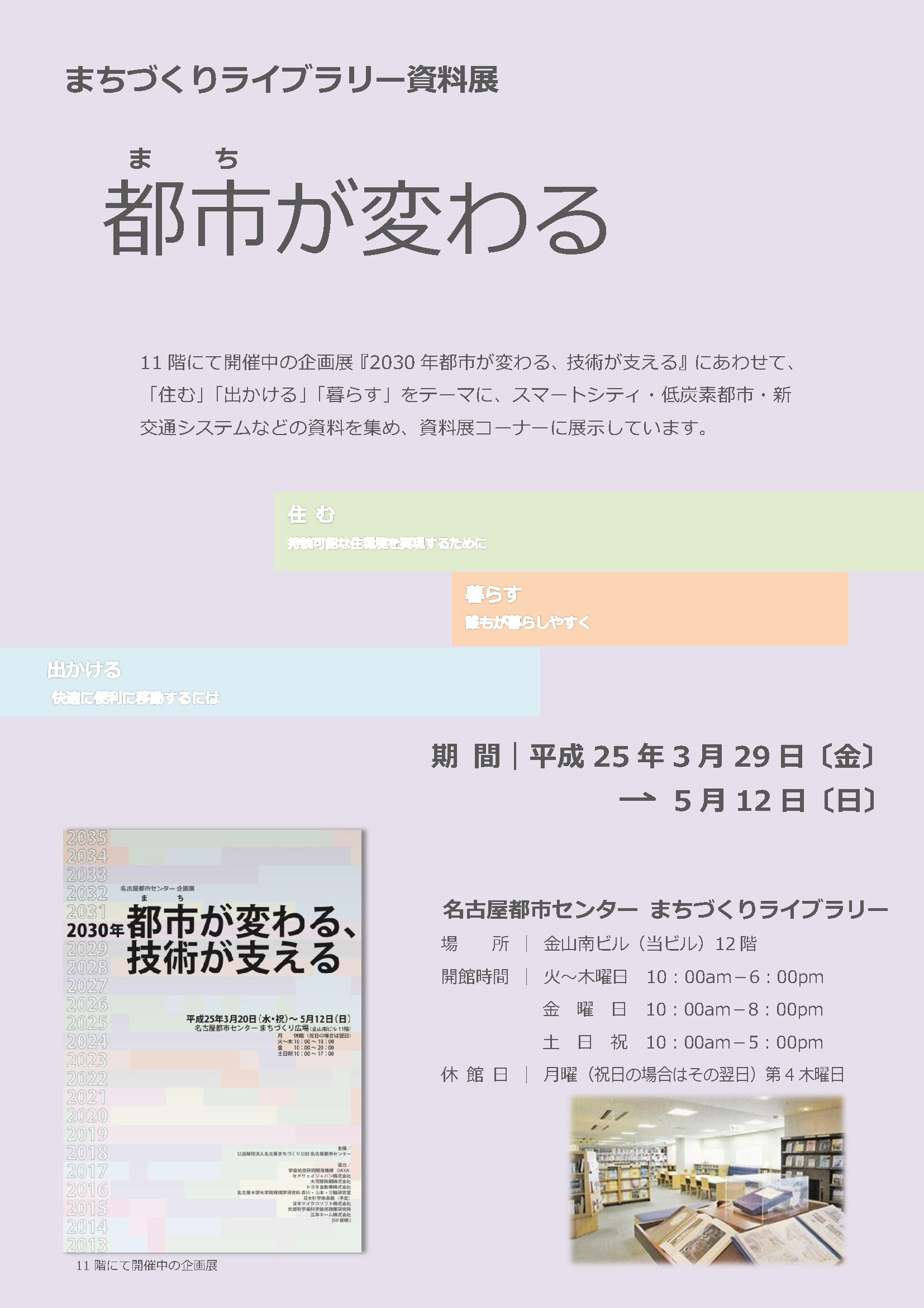 11階ホールにて開催中の企画展『2030年都市が変わる、技術が支える』にあわせて、「住む」「出かける」「暮らす」をテーマに、スマートシティ・低炭素都市・新交通システムなどの資料を集め、資料展コーナーに展示しています。